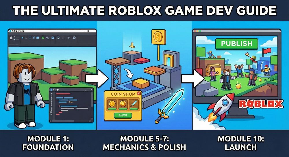 Your master course: 10 modules taking you from a blank baseplate to a published, monetized game.
